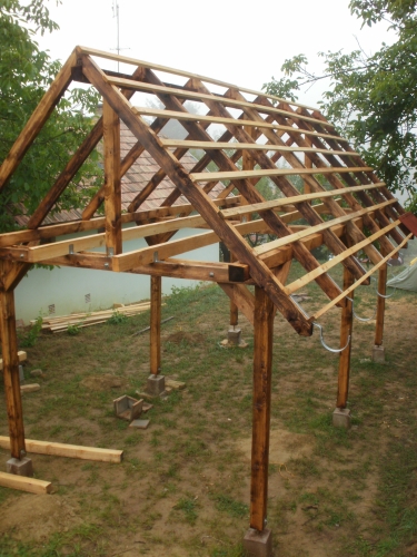 Közben persze készült – ha lassan is – a kiülő, talán a rozsdás-szüretre kész lesz. Sikerült cserepet kapni hozzá, az egyik oldalon felkerültek a tetőlécek (főleg Soma munkájának köszönhetően), és a fatároló betoncövekei is állnak. Már csak össze kéne rakni. Reméljük, a szeptember erre is ad majd időt, lehetőséget.