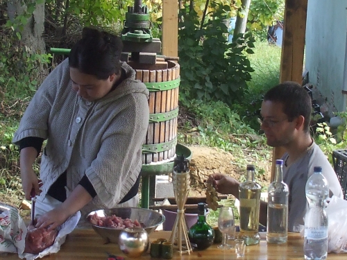 Korai kelés és bevásárlás után (elsősorban Andinak köszönhetően) mindenki hamar megtalálta a feladatát. A maradék szőlő leszedése és darálása után a fiúk nekiláttak a felesleges sorok (kordonosra alakítom a hagyományos művelésű területet, így néhány sort ki kell vágnom, ezek helyére azonban tavasszal egy-egy új sor kerül) kivágásának. Ezalatt Andi, Zsófi és Feri hozzálátott az Egzotikus elkészítésének – ősi kínai recept alapján készülő kiváló élettani hatású, vitalizáló egytálételt terveztünk ebédre, ennek Feri a mestere.