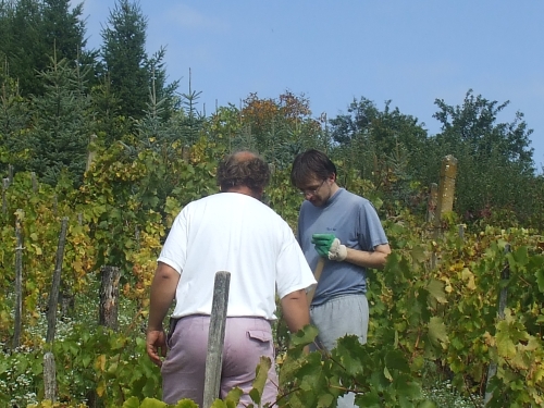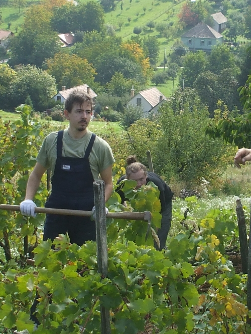 Közben befutott a harmadik autó is: Harkályék (illetve a velük érkező társaság) csak egy napra tudtak elszabadulni, azonban ilyen rövid idő alatt is rengeteget segítettek. A „Fácános” mellett ugyanis árválkodik egy közel egy hektáros egyesfüggöny művelésű terület, mely az idei évben már egyáltalán nem volt művelve, a támszerkezete düledező, permetszert nem látott, felverte a gaz, mégis rengeteg fürt mosolyog a tőkéken. Az idei őszön új tulajdonosa lett a területnek, aki ki akarja vágni a szőlőt, s a jelenlegi terméssel sem tervezett semmit. Így – engedélyével – erről a területről is szüreteltünk az idén, hogy tele legyen a hordó.