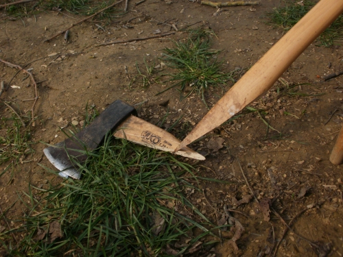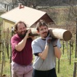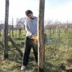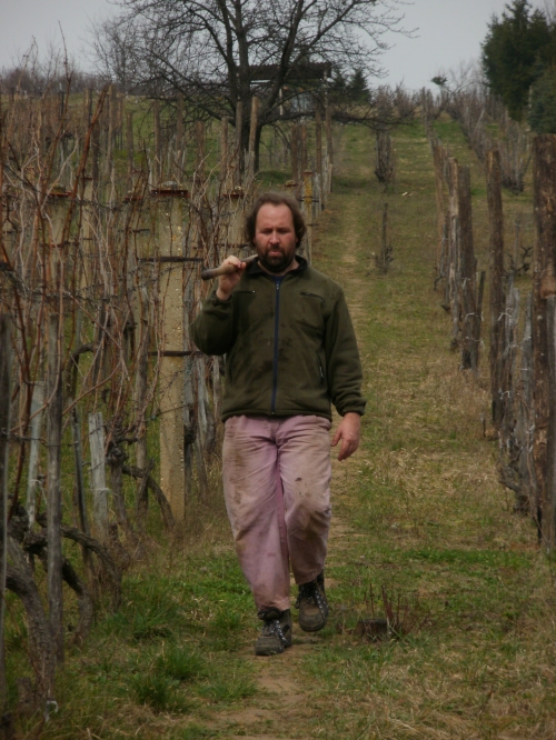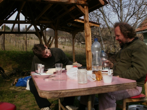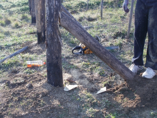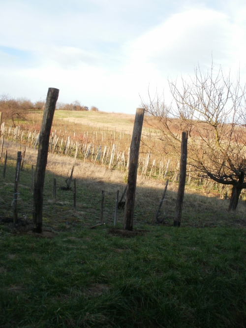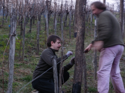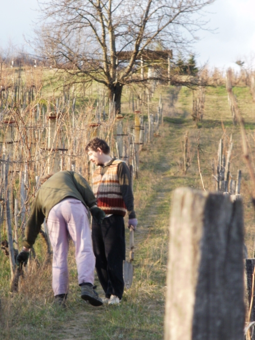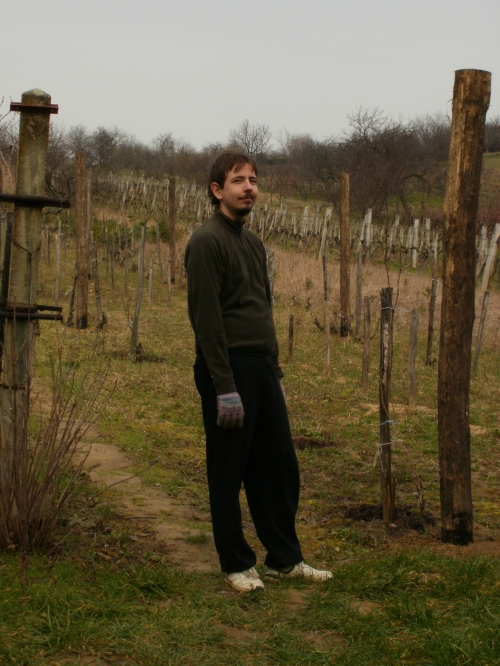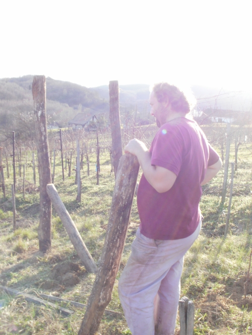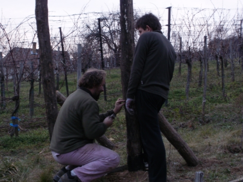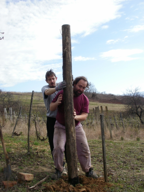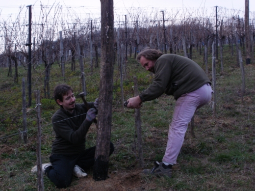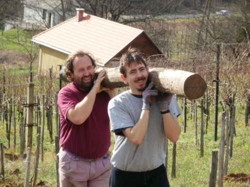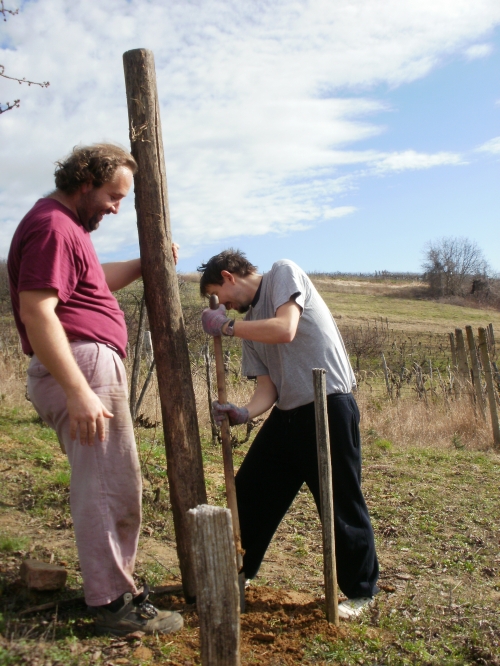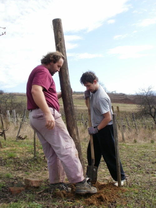 Pénteken aztán aput elvittem Veszprémig, ahova Petiék is érkeztek. Aztán nekiláttunk a kordonnak. Mialatt mi Petivel a meglehetősen nehéz és nedvességgel telt akácoszlopok alatt görnyedeztünk, Andi megkapálta az új telepítéseket, majd megmetszette a Rozsdás cuvée tőkéit. Ismét igénybe vehettük a nagyszerű motoros földfúrót, s a hosszas cipekedés után még drótot is húzhattunk. Peti javaslata alapján elgondolkodtam (s még most sem múlt el), hogy nem kéne-e mégis ezek helyett a böszme faoszlopok helyett a jövőben könnyű és vidám acéloszlopokat tenni a kordonokba...